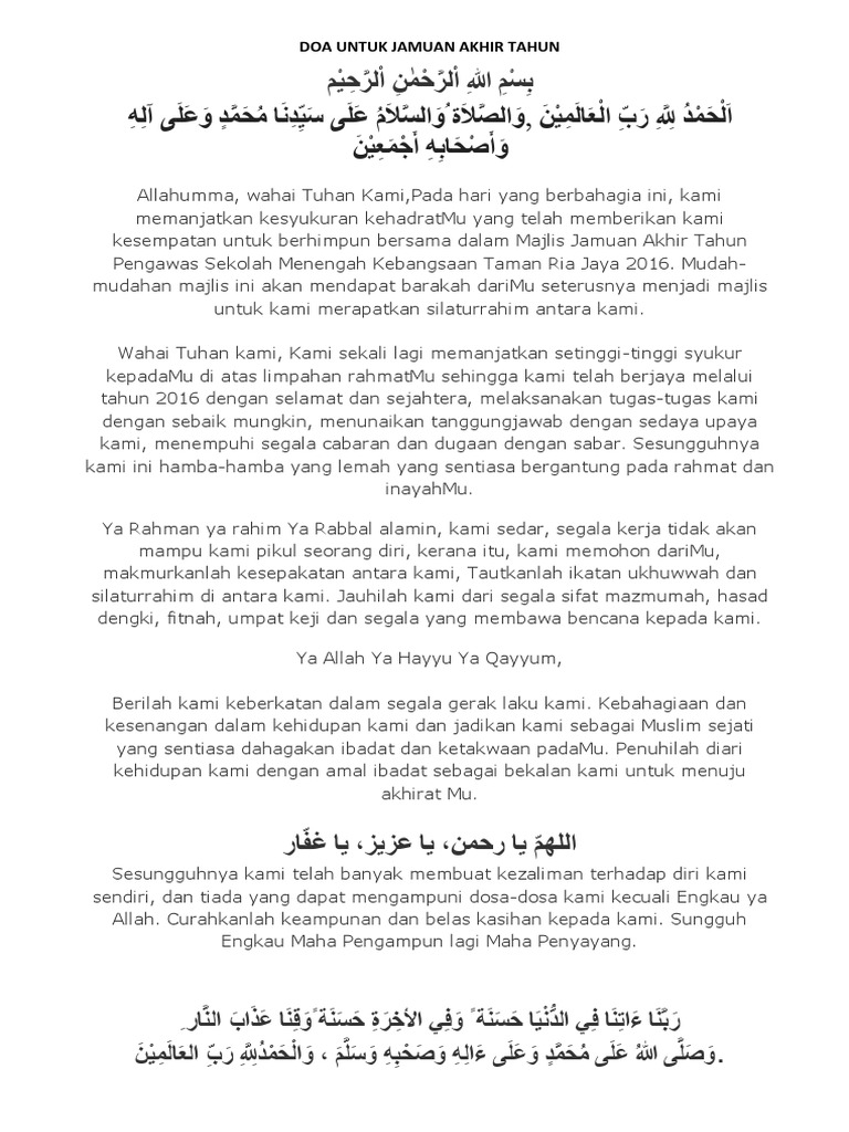 Contoh Teks Ucapan Pengacara Majlis Sempena Jamuan Akhir Tahun from imgv2-1-f.scribdassets.com Allahumma maa 'amiltu fii haadzihis sanati mimmaa nahaitanii 'anhu falam atub minhu walam tardlahu walam tansahuu wahalimta 'alayya ba'da qudratìka 'alaa 'uquubatii. Sesiapa yang membaca doa ini, syaitan berkata : Mengisi akhir tahun untuk instrospeksi diri. Doa akhir tahun dibaca 3 kali pada akhir waktu asar atau sebelum masuk waktu maghrib pada akhir bulan zulhijjah. Adab yang sebaiknya dilakukan ketika akhir tahun. Nk pamerkan serba sedikit ( x la sikit sgt ) f0t02x ketika jamuan last year at my school. Download lagu jamuan akhir tahun mp3 dan video mp4. Bahkan beberapa orang secara khusus membuat resolusi untuk memulai tahun baru.